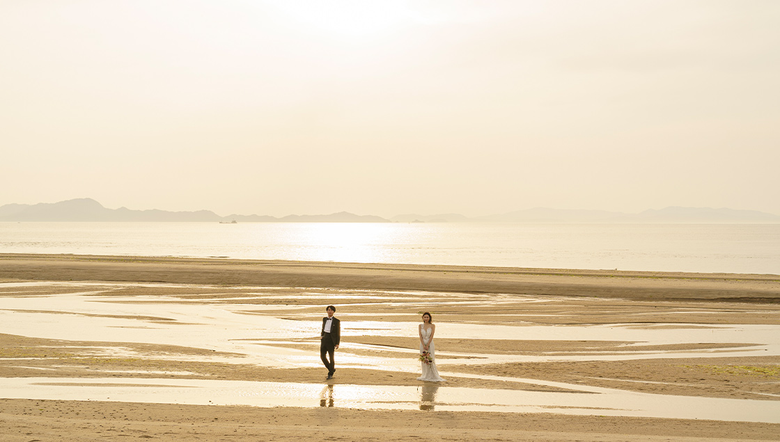 干潮時はリフレクションが幻想的。夕方からのサンセットも美しく、開放的でフォトジェニックな撮影が叶います。